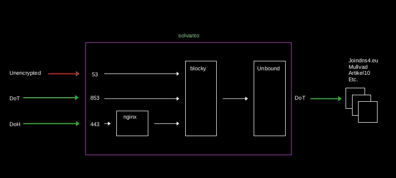 This UNIX server runs FreeBSD on a vps hosted in the public cloud of OVH. DNS is served by Unbound, forwarding queries encrypted using TLS (DOT) to artikel10.org, digitale-gesellschaft.ch, dns4eu, mullvad and uncensoreddns.org. Filtering is done by blocky. DOH is served using nginx. Or for the more visual inclined folks: a somewhat sloppily drawn picture may clarify matters.